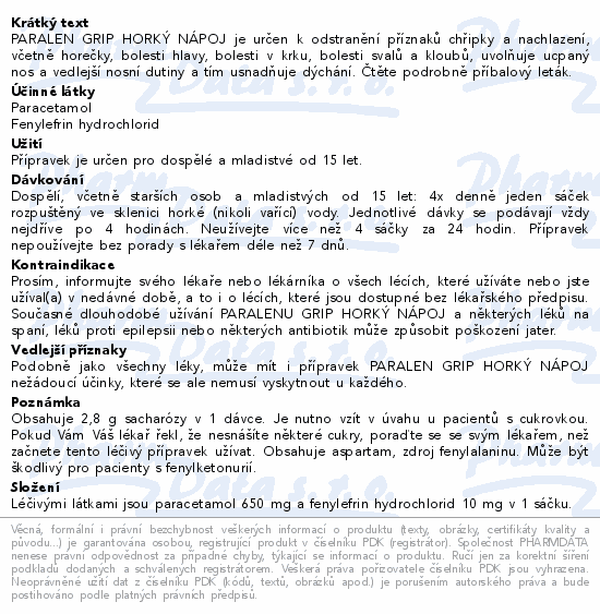 PARALEN GRIP HORKÝ NÁPOJ je určen k odstranění příznaků chřipky a nachlazení, včetně horečky, bolesti hlavy, bolesti v krku, bolesti svalů a kloubů, uvolňuje ucpaný nos a vedlejší nosní dutiny a tím usnadňuje dýchání. Čtěte pozorně příbalový leták.Použití
