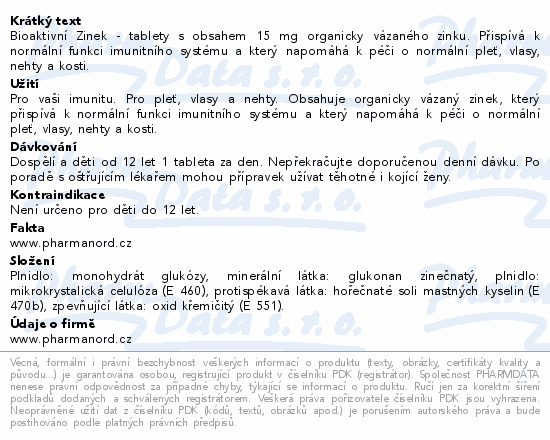 Bioaktivní Zinek - tablety s obsahem 15 mg organicky vázaného zinku. Přispívá k normální funkci imunitního systému a který napomáhá k péči o normální pleť, vlasy, nehty a kosti.Použití