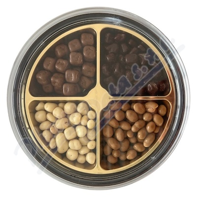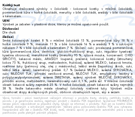 Obsahuje dražované výrobky v čokoládě - kokosové kostky v mléčné čokoládě, pomerančová kůra v hořké čokoládě, meruňky v bílé čokoládě, arašídy v bílé čokoládě s karamelem.Použití