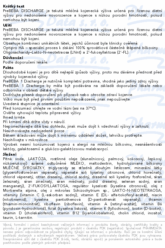 PreBEBA DISCHARGE je tekutá mléčná kojenecká výživa určená pro řízenou dietní výživu pro nedonošené novorozence a kojence s nízkou porodní hmotností, pokud nemohou být kojeni.Použití