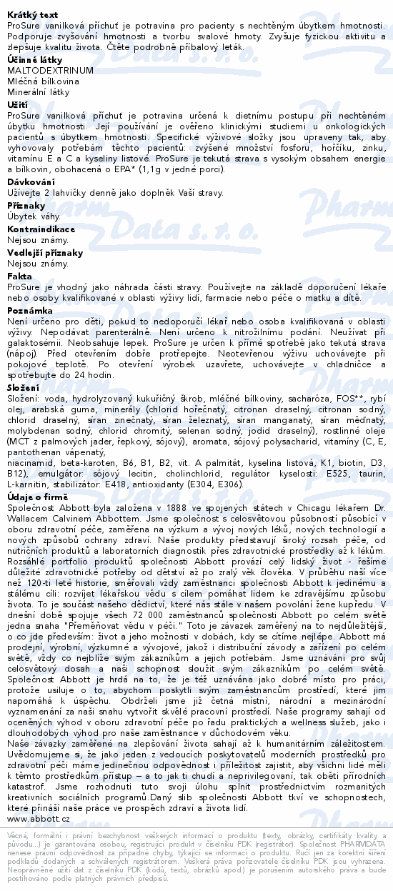 ProSure vanilková příchuť je potravina pro pacienty s nechtěným úbytkem hmotnosti. Podporuje zvyšování hmotnosti a tvorbu svalové hmoty. Zvyšuje fyzickou aktivitu a zlepšuje kvalitu života. Čtěte pozorně příbalový leták.Použití