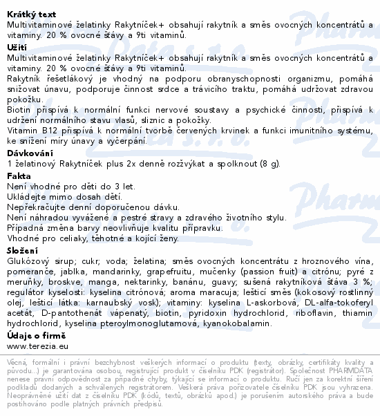 Multivitaminové želatinky Rakytníček+ obsahují rakytník a směs ovocných koncentrátů a vitaminy. 20 % ovocné šťávy a 9ti vitaminů.Použití