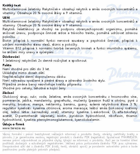 Multivitaminové želatinky Rakytníček+ obsahují rakytník a směs ovocných koncentrátů a vitaminy. Obsahuje 20 % ovocné šťávy a 9 vitaminů.Použití