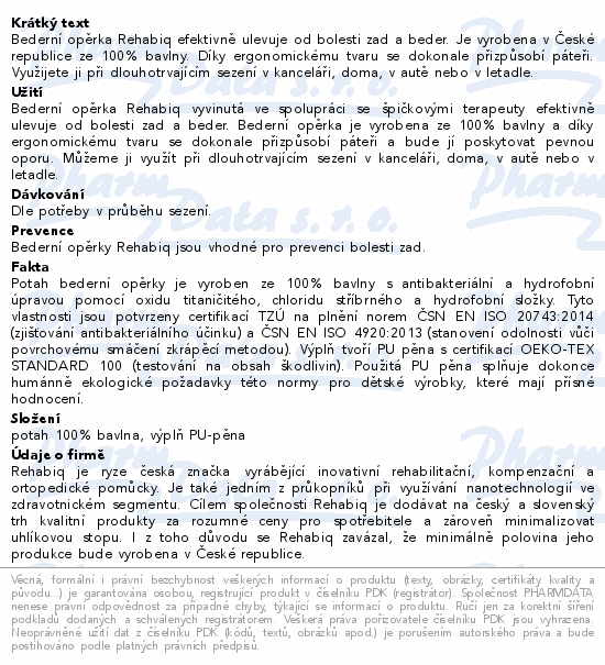 Bederní opěrka Rehabiq efektivně ulevuje od bolesti zad a beder. Je vyrobena v České republice ze 100% bavlny. Díky ergonomickému tvaru se dokonale přizpůsobí páteři. Využijete ji při dlouhotrvajícím sezení v kanceláři, doma, v autě nebo v letadle.Použití