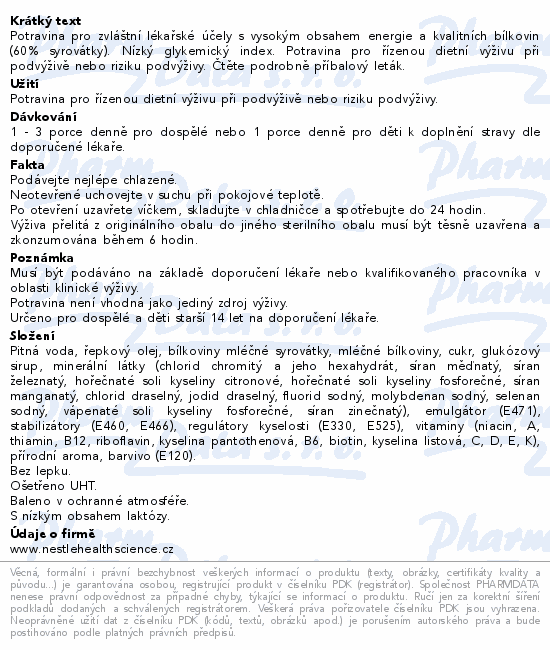 Potravina pro zvláštní lékařské účely s vysokým obsahem energie a kvalitních bílkovin (60% syrovátky). Nízký glykemický index. Potravina pro řízenou dietní výživu při podvýživě nebo riziku podvýživy. Čtěte pozorně příbalový leták.Použití