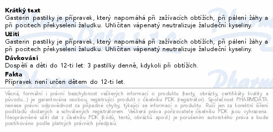Gasterin pastilky je přípravek, který napomáhá při zažívacích obtížích, při pálení žáhy a při pocitech překyselení žaludku. Uhličitan vápenatý neutralizuje žaludeční kyseliny.Použití