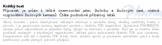 Přípravek je určen k léčbě onemocnění jater, žlučníku a žlučových cest, včetně rozpouštění žlučových kamenů. Čtěte pozorně příbalový leták.Použití