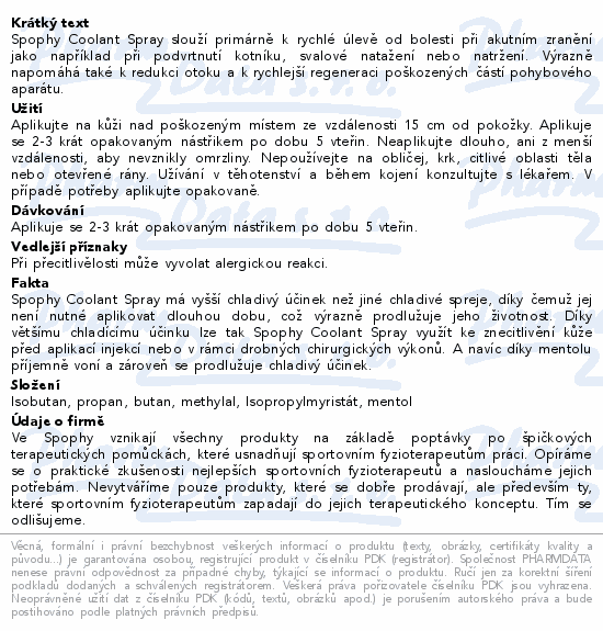 Spophy Coolant Spray slouží primárně k rychlé úlevě od bolesti při akutním zranění jako například při podvrtnutí kotníku, svalové natažení nebo natržení. Výrazně napomáhá také k redukci otoku a k rychlejší regeneraci poškozených částí pohybového aparátu.Použití