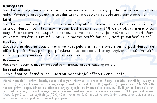 Srdíčka jsou vyrobena z měkkého latexového odlitku, který podepírá příčně plochou nohu. Povrch je překryt usní a spodní strana je opatřena celoplošnou samolepicí fólií.Použití