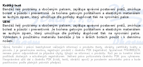 Bandáž řeší problémy s vbočeným palcem, zajišťuje správné postavení prstů, zmírňuje bolest a působí i preventivně. Je tvořena gelovým polštářkem a elastickým materiálem se suchým zipem, který umožňuje dle potřeby stupňovat tlak na vyrovnání palce.Použití