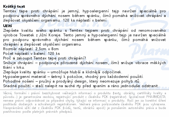 Temtex tape proti chrápání je jemný, hypoalergenní tejp navržen speciálně pro podporu správného dýchání nosem během spánku, čímž pomáhá snižovat chrápání a zlepšovat okysličení organismu. 120 ks náplastí v balení.Použití