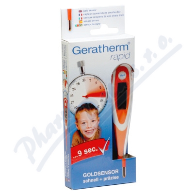 Teploměr Rapid Geratherm je digitální rychloběžka s ohebným koncem, určená k měření v ústech nebo konečníku do 10 vteřin, rychlé a přesné měření.Použití