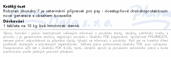 Roboran chondro 7 je veterinární přípravek pro psy - vícestupňové chondroprotektivum nové generace s obsahem boswellie.Použití