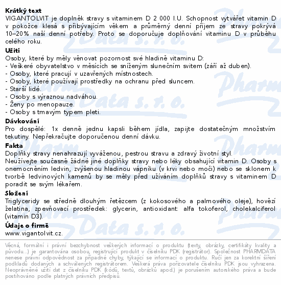 VIGANTOLVIT je doplněk stravy s vitaminem D 2 000 I.U. Schopnost vytvářet vitamin D v pokožce klesá s přibývajícím věkem a průměrný denní příjem ze stravy pokrývá 10–20% naší denní potřeby. Proto se doporučuje doplňování vitaminu D v průběhu celého roku.Použití