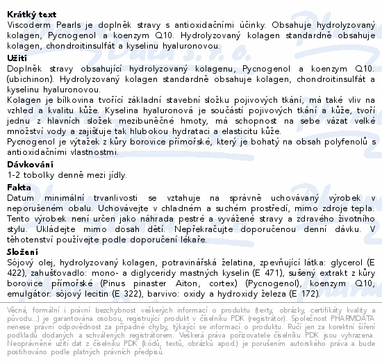 Viscoderm Pearls je doplněk stravy s antioxidačními účinky. Obsahuje hydrolyzovaný kolagen, Pycnogenol a koenzym Q10. Hydrolyzovaný kolagen standardně obsahuje kolagen, chondroitinsulfát a kyselinu hyaluronovou.Použití