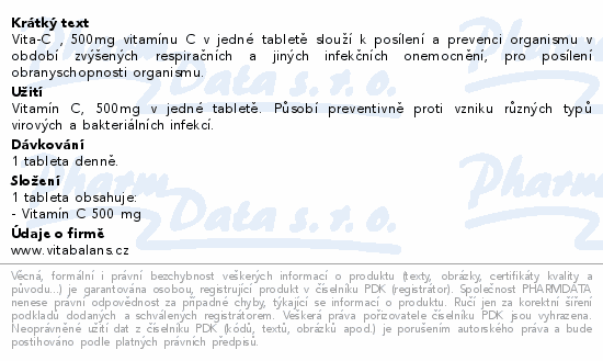 Vita-C , 500mg vitamínu C v jedné tabletě slouží k posílení a prevenci organismu v období zvýšených respiračních a jiných infekčních onemocnění, pro posílení obranyschopnosti organismu.Použití