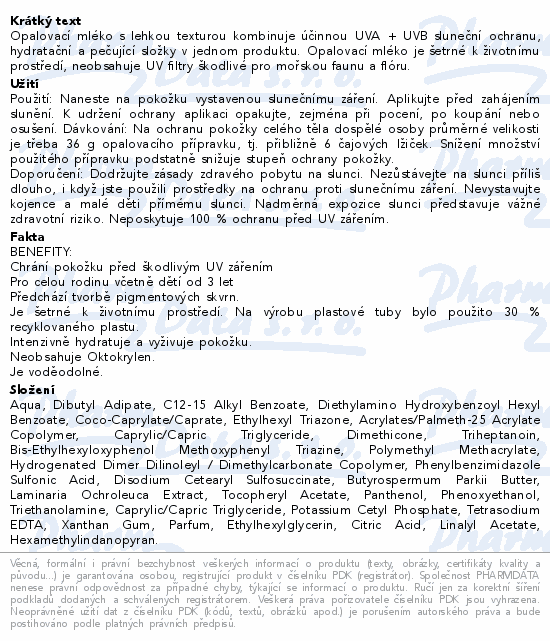 Opalovací mléko s lehkou texturou kombinuje účinnou UVA + UVB sluneční ochranu, hydratační a pečující složky v jednom produktu. Opalovací mléko je šetrné k životnímu prostředí, neobsahuje UV filtry škodlivé pro mořskou faunu a flóru.Použití