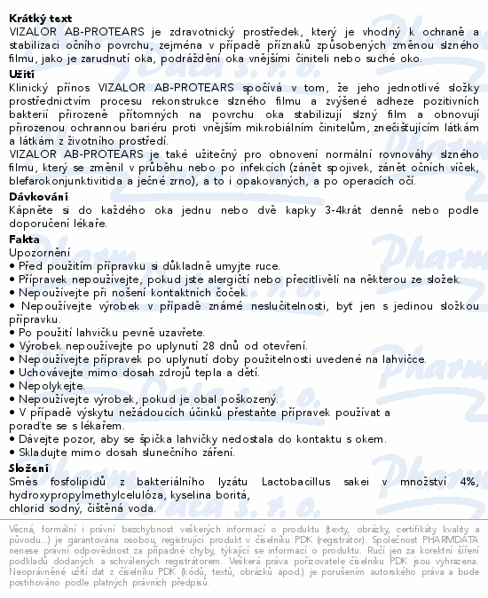 VIZALOR AB-PROTEARS je zdravotnický prostředek, který je vhodný k ochraně a stabilizaci očního povrchu, zejména v případě příznaků způsobených změnou slzného filmu, jako je zarudnutí oka, podráždění oka vnějšími činiteli nebo suché oko.Použití