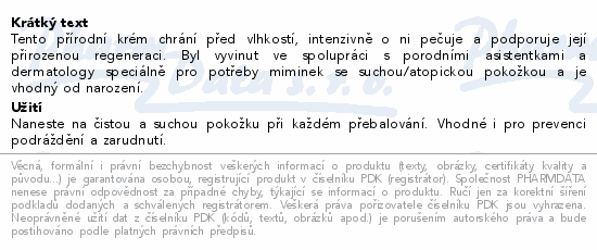 Tento přírodní krém chrání před vlhkostí, intenzivně o ni pečuje a podporuje její přirozenou regeneraci. Byl vyvinut ve spolupráci s porodními asistentkami a dermatology speciálně pro potřeby miminek se suchouPoužití