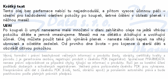 Tento olej bez parfemace nabízí tu nejjednodušší, a přitom vysoce účinnou péči – ideální pro každodenní ošetření pokožky po koupeli, šetrné čištění v oblasti plenek i něžnou masáž.Použití