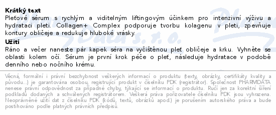 Pleťové sérum s rychlým a viditelným liftingovým účinkem pro intenzivní výživu a hydrataci pleti. Collagen+ Complex podporuje tvorbu kolagenu v pleti, zpevňuje kontury obličeje a redukuje hluboké vrásky.Použití