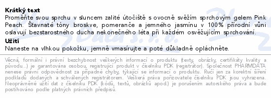 Proměňte svou sprchu v sluncem zalité útočiště s ovocně svěžím sprchovým gelem Pink Peach. Šťavnaté tóny broskve, pomeranče a jemného jasmínu v 100% přírodní vůni oslavují bezstarostného ducha nekonečného léta při každém osvěžujícím sprchování.Použití