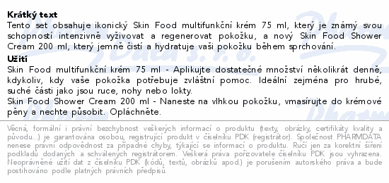 Tento set obsahuje ikonický Skin Food multifunkční krém 75 ml, který je známý svou schopností intenzivně vyživovat a regenerovat pokožku, a nový Skin Food Shower Cream 200 ml, který jemně čistí a hydratuje vaši pokožku během sprchování.Použití