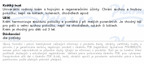 Univerzální rodinný krém s hojivými a regeneračními účinky. Chrání suchou a hrubou pokožku, např. na loktech, kolenech, chodidlech apod.Použití