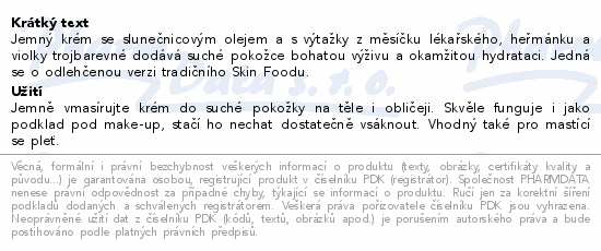 Jemný krém se slunečnicovým olejem a s výtažky z měsíčku lékařského, heřmánku a violky trojbarevné dodává suché pokožce bohatou výživu a okamžitou hydrataci. Jedná se o odlehčenou verzi tradičního Skin Foodu.Použití