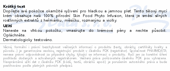 Dopřejte své pokožce okamžité vyživení pro hladkou a jemnou pleť. Tento tělový mycí krém obsahuje naši 100% přírodní Skin Food Phyto Infusion, která je směsí silných rostlinných extraktů z heřmánku, měsíčku, rozmarýnu a violky.Použití