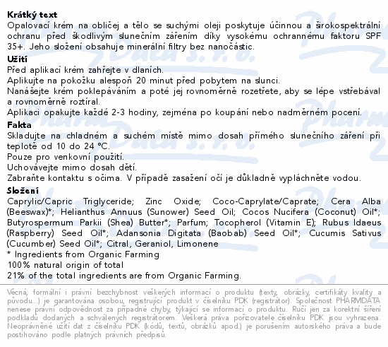 Opalovací krém na obličej a tělo se suchými oleji poskytuje účinnou a širokospektrální ochranu před škodlivým slunečním zářením díky vysokému ochrannému faktoru SPF 35+. Jeho složení obsahuje minerální filtry bez nanočástic.Použití