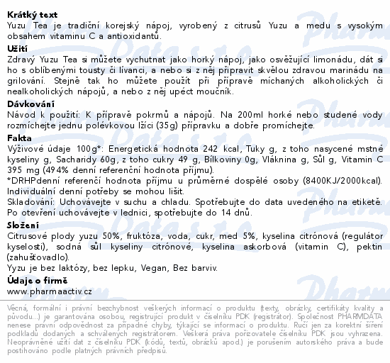 Yuzu Tea je tradiční korejský nápoj, vyrobený z citrusů Yuzu a medu s vysokým obsahem vitaminu C a antioxidantů.Použití